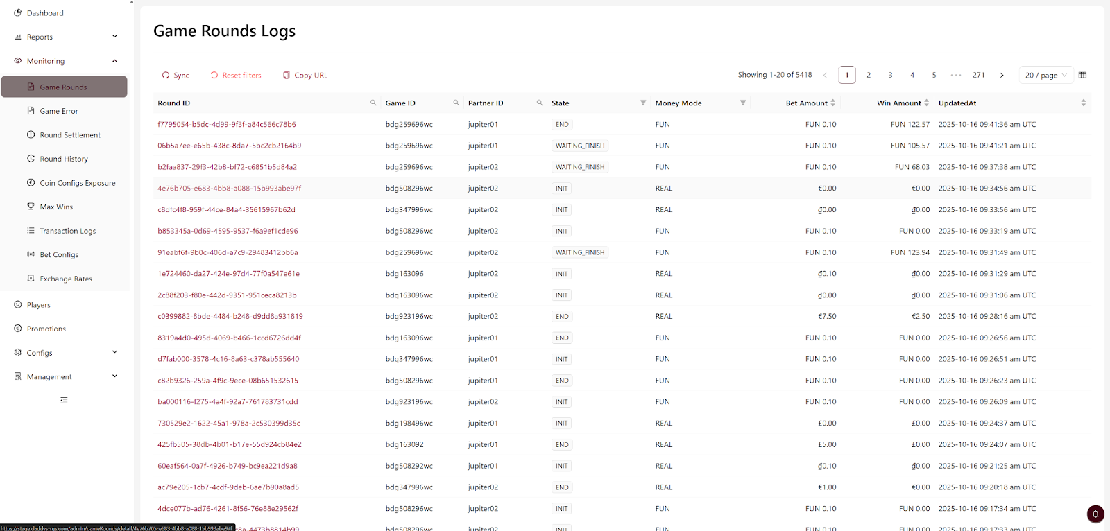 - Navigate to Admin → Reports → Game Rounds → Search by Round ID/Player ID.